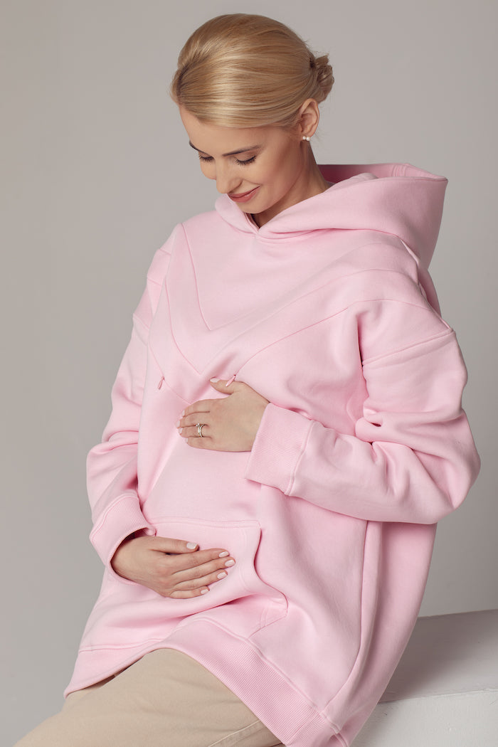 Oversized maternity hoodie in sweatshirt fabric with a lined hood, kangaroo pocket, and ribbing at the cuffs and hem.